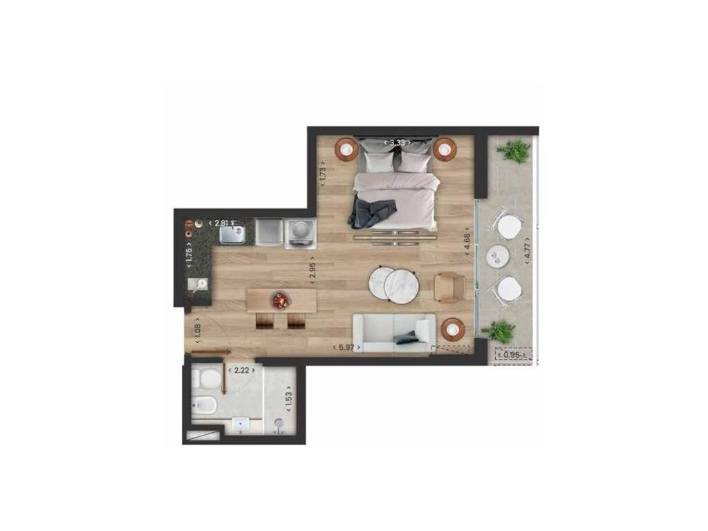 Living comedor con cocina integrada con muebles sobre y bajo mesada, anafe vitrocerámico con 2 hornallas, campana instalada, y previsión para horno eléctrico empotrado. Baño completo. Terraza de uso exclusivo. 1 Dormitorio.