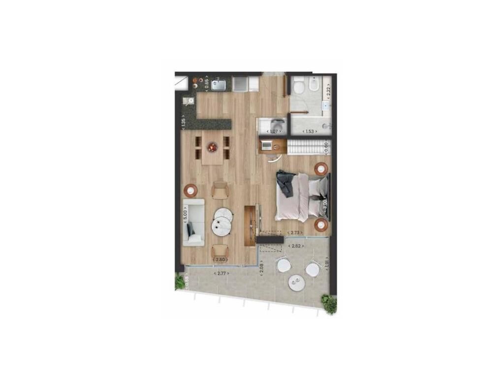 Living comedor con cocina integrada con muebles sobre y bajo mesada, anafe vitrocerámico con 2 hornallas, campana instalada, y previsión para horno eléctrico empotrado. Baño completo. Terraza de uso exclusivo. 1 Dormitorio.