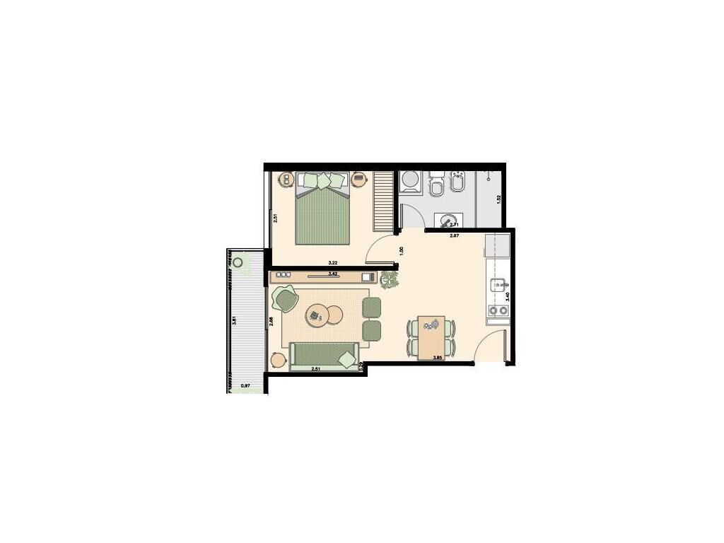 Apartamento living comedor con acceso a terraza de uso exclusivo, cocina integrada equipada con mueble bajo mesada, mueble aéreo, anafe, campana y horno de empotrar. Dormitorio con Placar con hoja batiente. Baño completo.