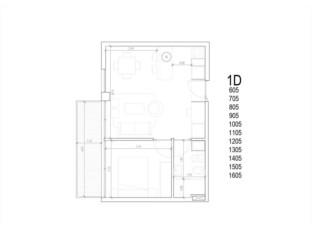 Living comedor con acceso a terraza de uso exclusivo. Cocina integrada con bajo mesada. Baño completo. Un dormitorio.