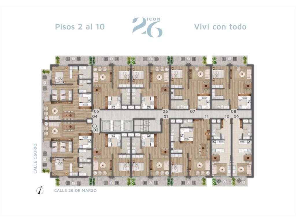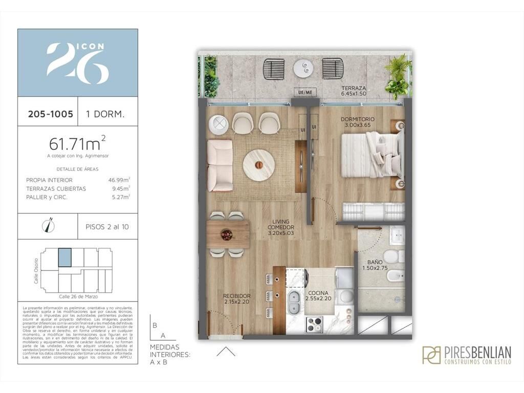 Apartamento que combina la sala de estar con el comedor, y cocina integrada.1 Dormitorio. Estos ambientes se extienden hacia la terraza generando mayor amplitud y un espacio extra de esparcimiento. Baño Completo.