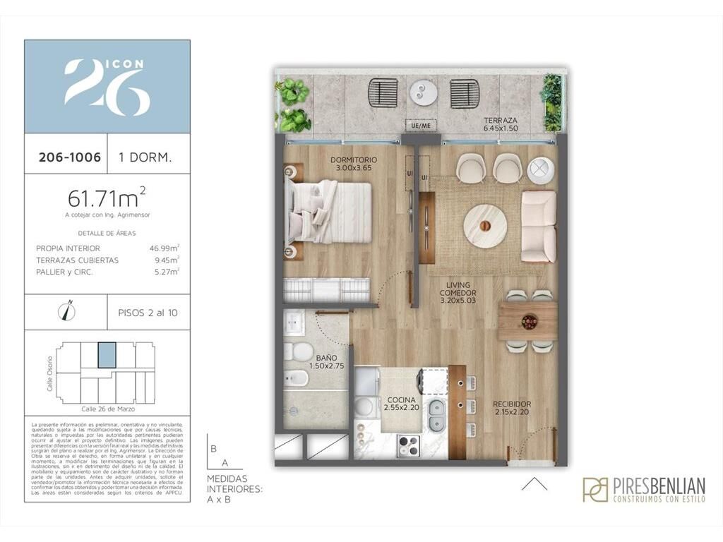 Apartamento que combina la sala de estar con el comedor, y cocina integrada.1 Dormitorio. Estos ambientes se extienden hacia la terraza generando mayor amplitud y un espacio extra de esparcimiento. Baño Completo.