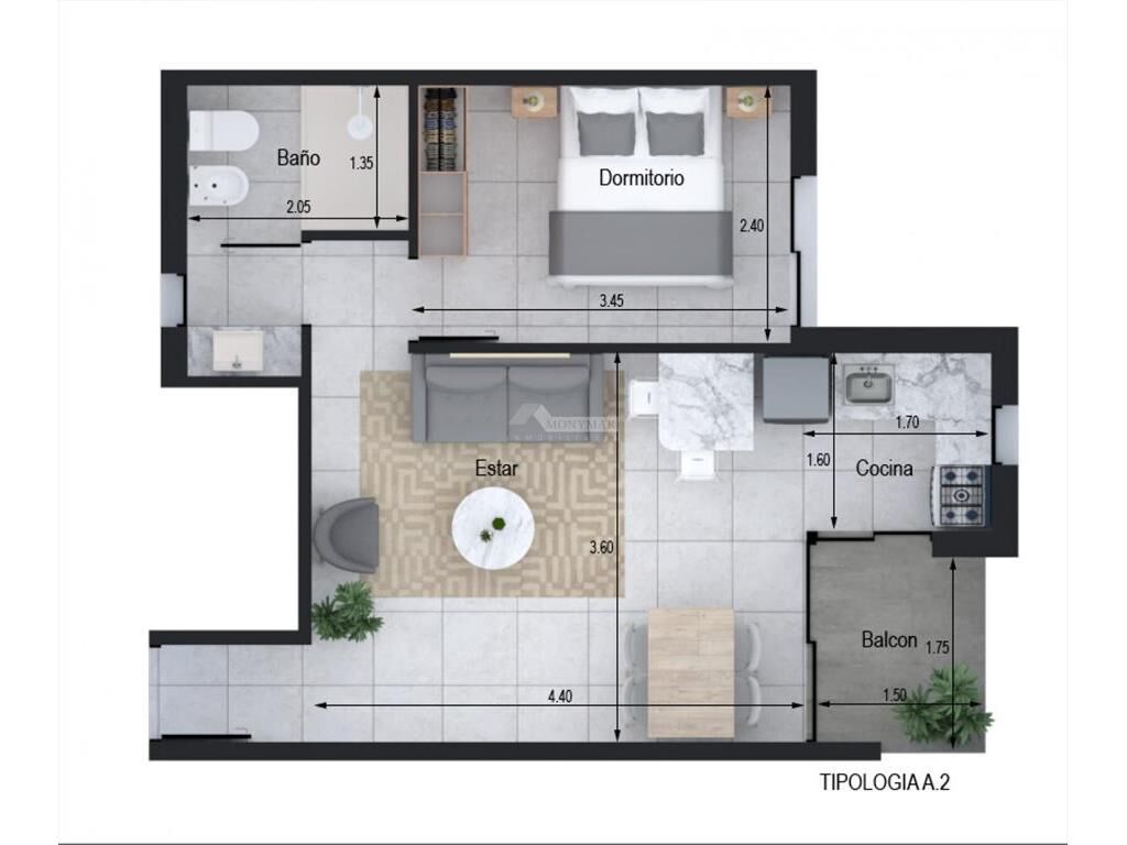 202 a 902) 37,5m área propia + 3m terraza = 40,5m Total.