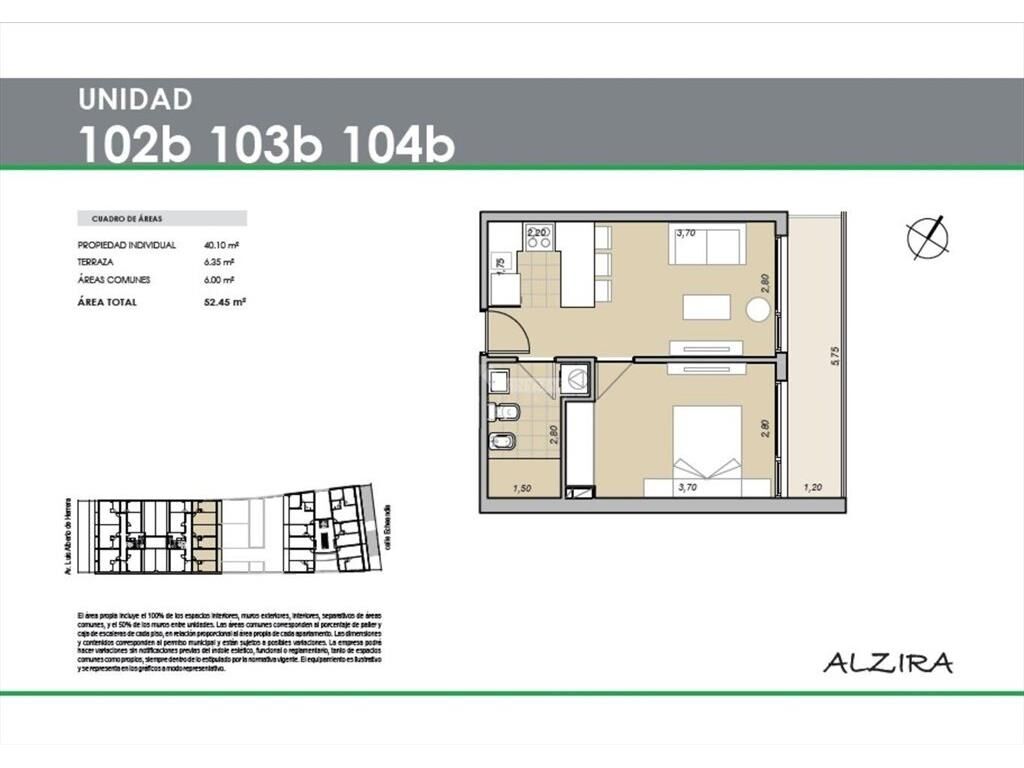 METRAJE: 40,10m área propia + 6,00m área común + 6,35m área terraza = 52,45m totales.