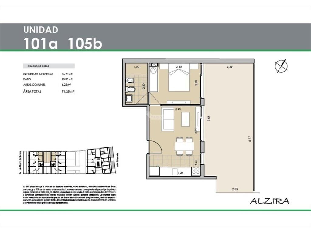METRAJE: 36,70m área propia + 6,25m área común + 28,30m área terraza = 71,25m totales.