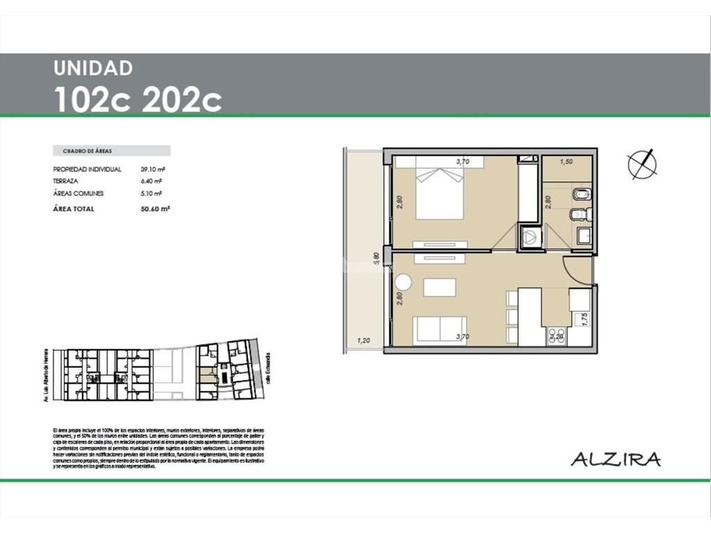 METRAJE: 39,10m área propia + 5,10m área común + 6,40m área terraza = 50,60m totales.
