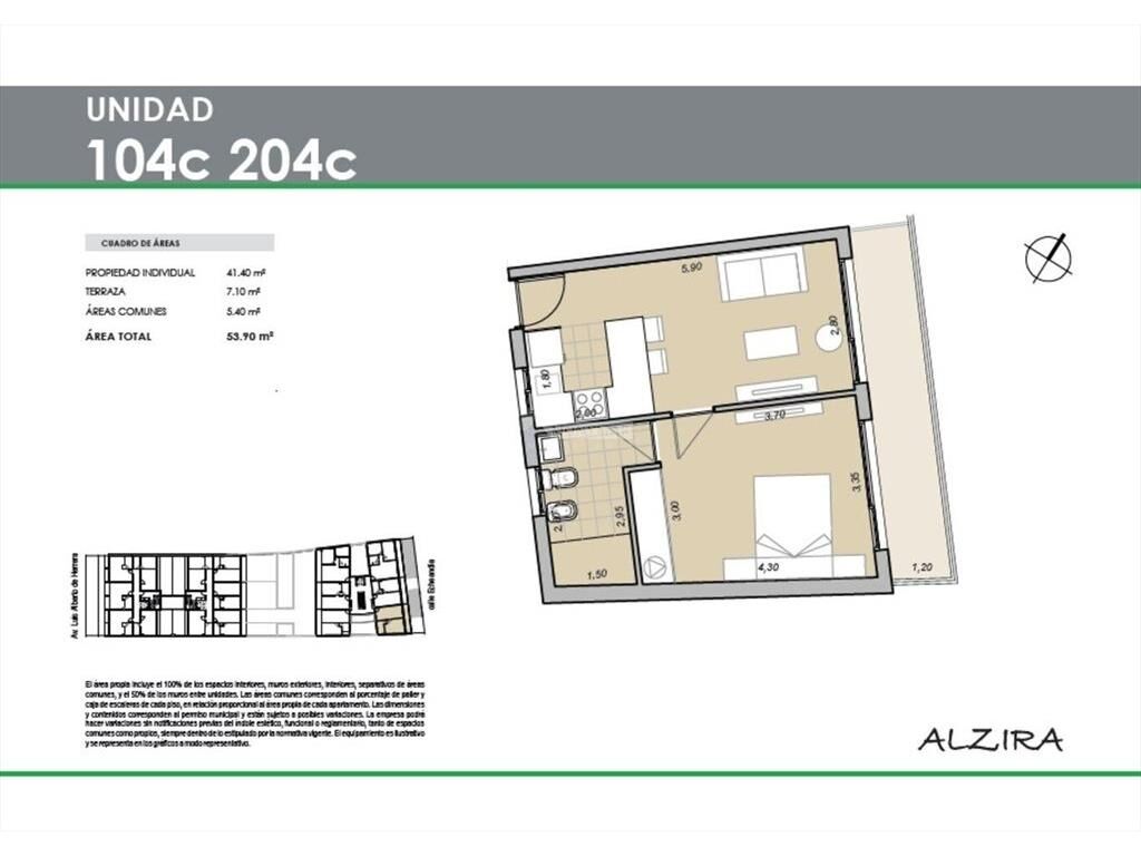METRAJE: 41,40m área propia + 5,40m área común + 7,10m área terraza = 53,90m totales.