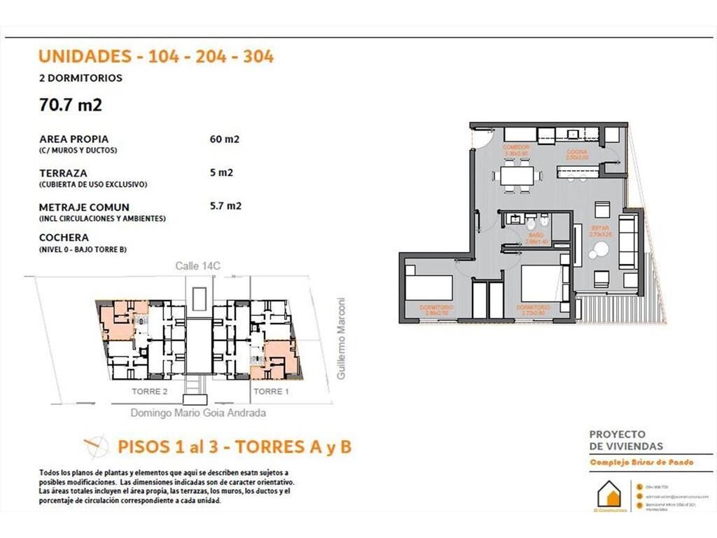 Se vende apartamento en pozo ubicado en un punto tranquilo de la ciudad con fácil acceso y egreso tanto hacía Montevideo, como hacía el este. El complejo Brisas de Pando comienza sus obras en el año 2026, tiene fecha prevista de entrega en Diciembre de 2027, son dos torres de edificios, en total 28 apartamentos de uno y dos dormitorios, ascensor en cada torre, cocheras, piscina, parrillero en planta baja, gimnasio y barbacoas con solarium en azoteas. Predio cerrado con circuito de videovigilancia.