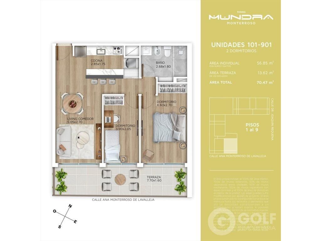 Venta de apartamento al frente de 2 dormitorios con terraza  El apartamento cuenta con: -Living comedor -Cocina integrada por barra -Terraza con acceso desde living y dormitorios -Dos dormitorios -Baño completo -Área de lavadero Terminaciones en living comedor, dormitorio y circulaciones: - Piso vinílico de listones símil madera. - Ventanas de aluminio color negro con sistema de doble vidrio hermético (DVH). - Cortina de enrollar. - Placard en dormitorios con puertas corredizas en melamínico. - Cerradura digital en puerta de acceso. - Portero eléctrico con visor. Terminaciones en terraza: - Pavimento cerámico antideslizante de calidad. - Barandas de vidrio templado y aluminio negro. - Iluminación decorativa. Terminaciones cocina: - Mesadas símil Silestone, pileta de acero inoxidable y grifo monomando. - Muebles bajo y sobre mesadas en carpintería modular terminación melamínico con tiradores de acero inoxidable. - Previsión para instalación de campana o extractor. Terminaciones baño: - Lavatorio con mueble melamínico integrado y espejo instalado. Amenities: - Barbacoa con parrillero interior - Dos terrazas panorámicas - Laundry con app - Bici parking con soportes - Gimnasio equipado Cochera opcional desde U$S 20.000 Gastos de ocupación: 4,5% (4% gastos de conexiones, reglamento de copropiedad, plano de mensura y alhajamiento de espacios comunes + 0,5% fondo para gastos comunes) Comisión Inmobiliaria 3% + IVA TORRES MUNDRA es un emprendimiento inmobiliario con los beneficios y exoneraciones tributarias para los compradores previstos por la Ley de Vivienda Promovida (18.795). POR 10 AÑOS MÁS Exoneración del ITP (2% sobre el valor de Catastro). Exoneración del IVA del precio de compra. AL MOMENTO DE LA COMPRA Exoneración del Impuesto a la Renta de los Alquileres. Exoneración del Impuesto al Patrimonio. INMOBILIARIA GOLF Afiliados a Cámara Inmobiliaria Uruguaya