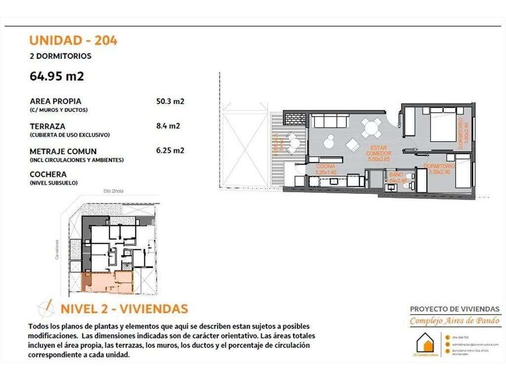 La unidad 204 se ubica sobre la calle Manuel Oribe (ex Canelones), sus vistas permitirán disfrutar de hermosos atardeceres con una gran vista despejada, cuenta con 65m² propios de apartamento (living con cocina semi integrada mediante barra, lavadero, baño y dos dormitorios) y gran terraza de 8,4m² con parrillero propio.