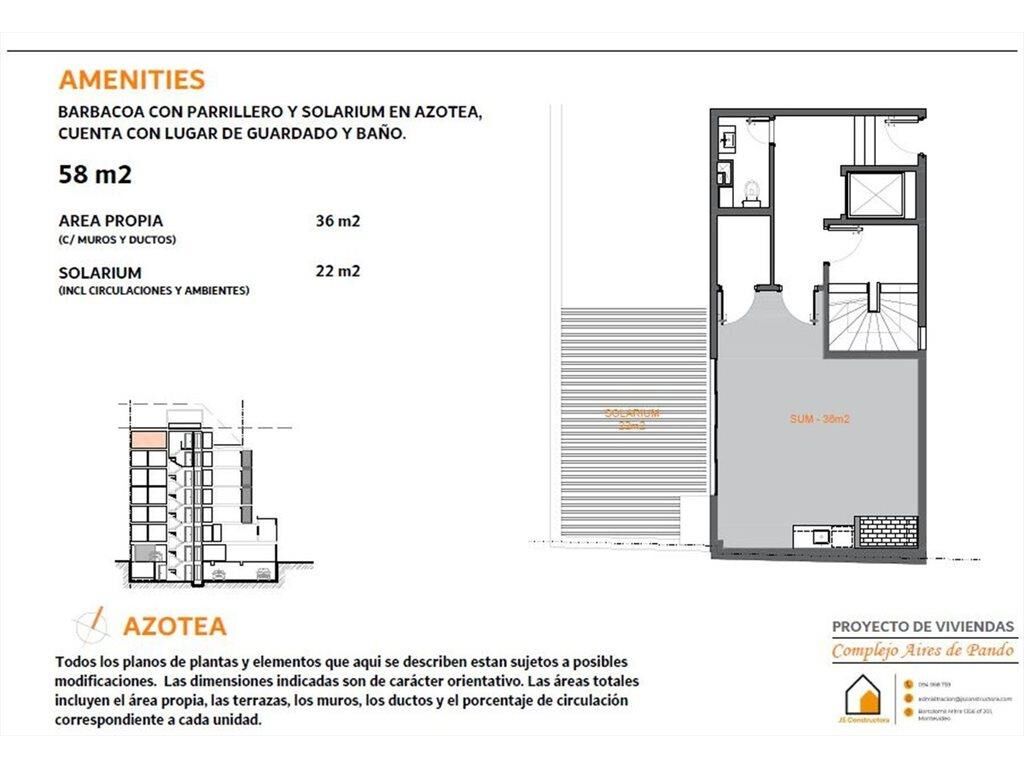 El complejo Aires de Pando comienza sus obras el próximo año 2026, tiene fecha prevista de entrega a fines del año 2027, es una torre con 2 locales comerciales y 20 apartamentos de uno, dos y tres dormitorios, ascensor, cocheras en planta baja y subsuelo y barbacoa con solarium en el roof top.