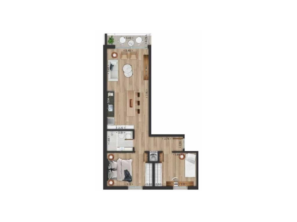 Living comedor con acceso a terraza de uso exclusivo. Cocina integrada con muebles sobre y bajo mesada, anafe vitrocerámico con 4 hornallas, campana instalada, y previsión para horno eléctrico empotrado. Baño completo. Dos dormitorios.