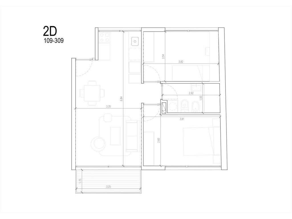 Cómodo living comedor que se extiende a una terraza. Cocina integrada con muebles bajo mesada. Baño completo.