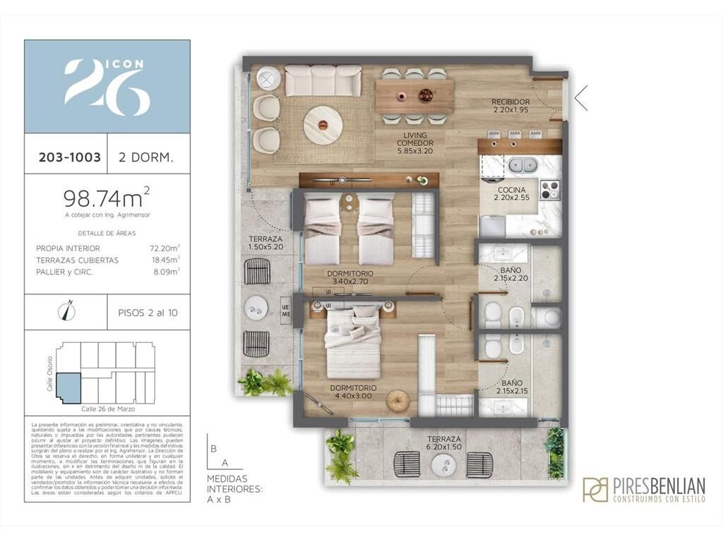 Dormitorio principal con vestidor y baño en suite. Estos ambientes se extienden hacia la terraza al frente generando mayor amplitud y un espacio extra de esparcimiento. Segundo dormitorio con salida a terraza lateral con vista a José L. Osorio. Baño Completo.
