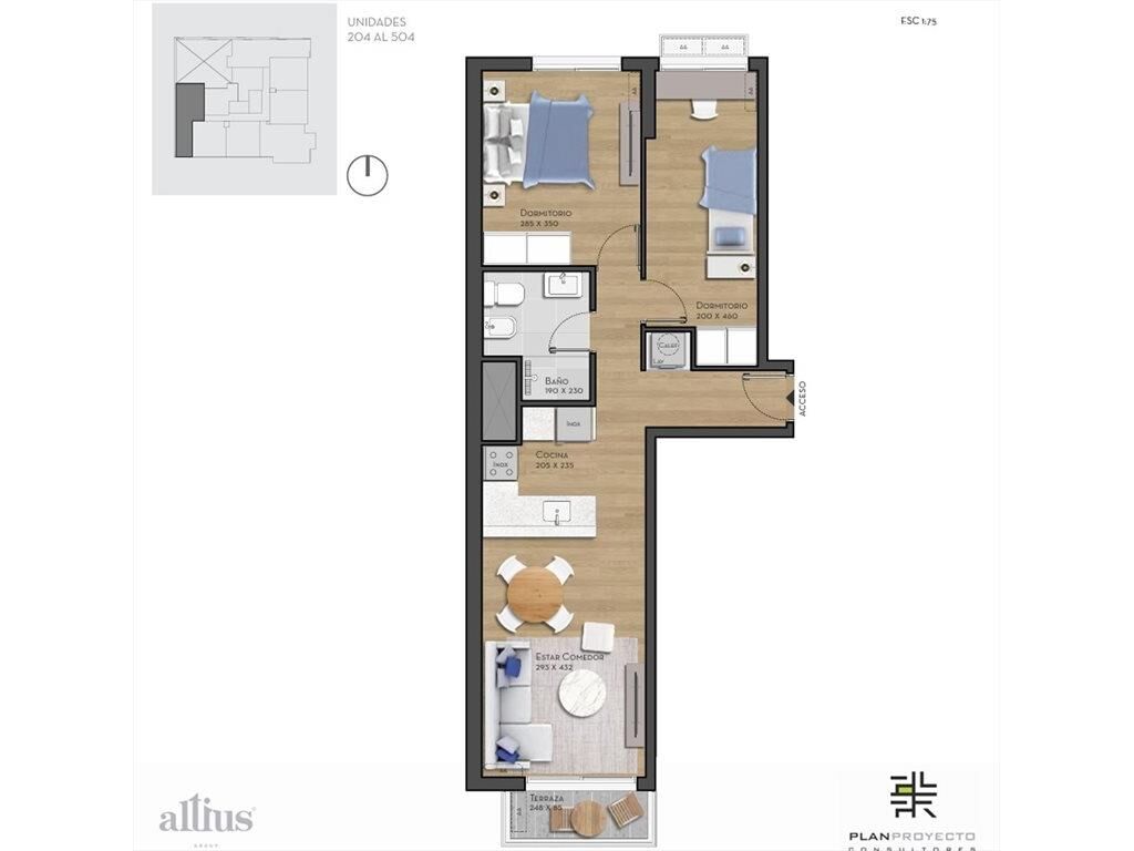 Unidad 304. Acceso mediante cerradura electrónica. Hall de acceso. Living comedor con cocina integrada con muebles aéreos y bajo mesada. Previsión para aire acondicionado y persiana. Pavimento vinílico de alto tránsito en listones símil madera. Terraza al frente. 2 dormitorios al contrafrente. Baño completo con mueble bajo pileta, columna de ducha y espejo. Nicho con conexión para lavarropas.