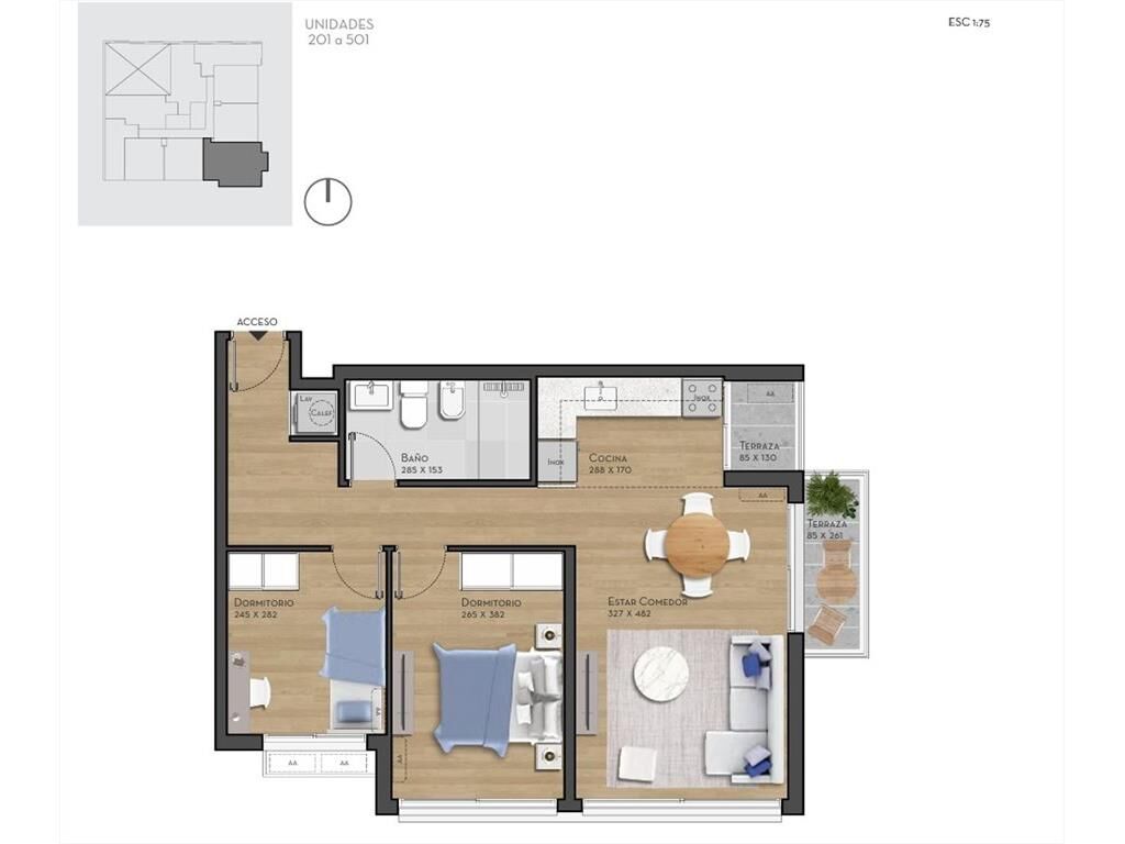 Unidad 401. Acceso mediante cerradura electrónica. Hall de acceso. Living comedor al frente con terraza. Cocina semi definida con muebles aéreos y bajo mesada. Terraza de servicio. Previsión para aire acondicionado y persiana. Pavimento vinílico de alto tránsito en listones símil madera. 2 dormitorios al frente. Baño completo con mueble bajo pileta, columna de ducha y espejo. Nicho con conexión para lavarropas.