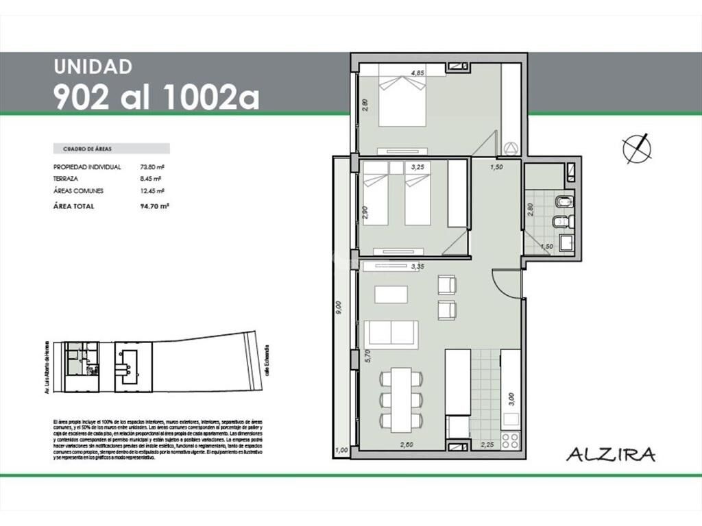 METRAJE: 73,80m área propia + 12,45m área común + 8,45m área terraza = 94,70m totales.