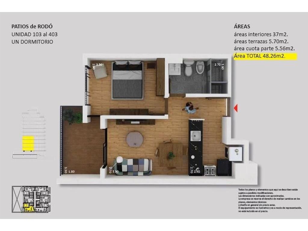 La UNIDAD 203 se desarrolla a contra frente con 36.4 m2 de área privada y 5,60 m2 de terraza, teniendo cómodas dimensiones para una excelente circulación en el área.