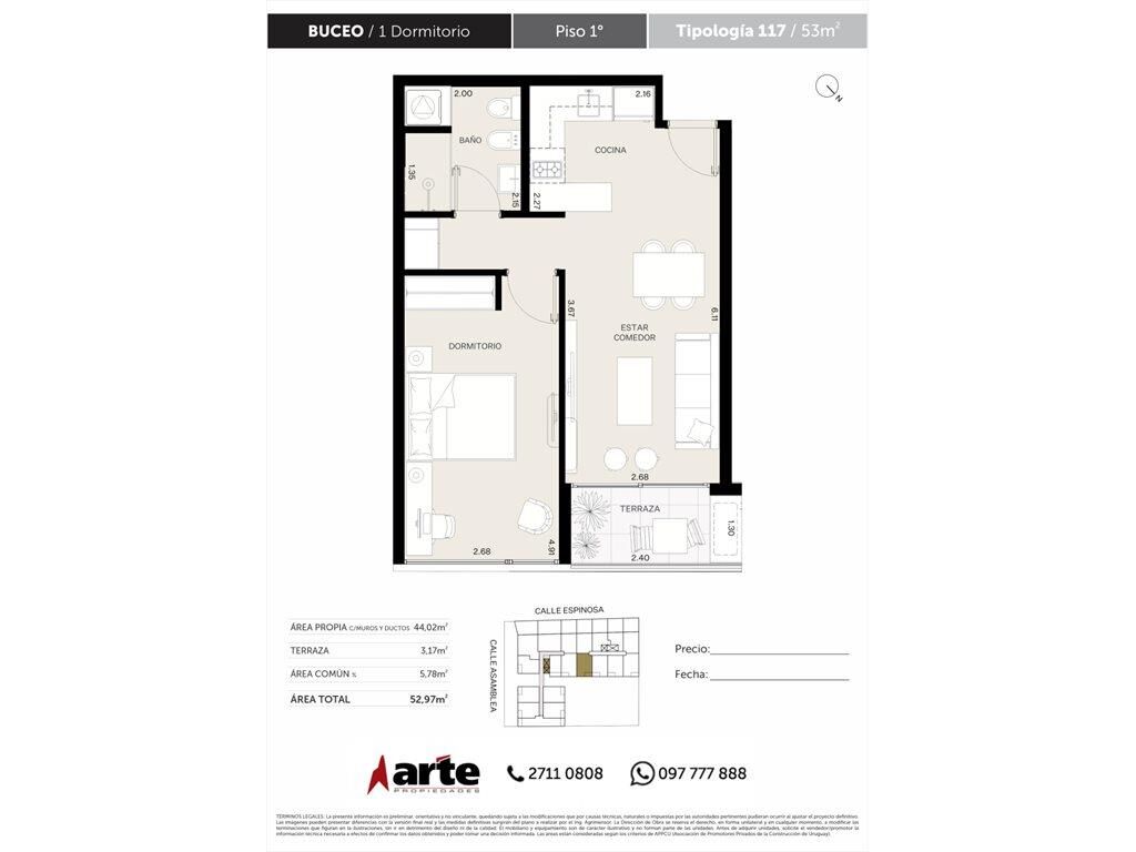 Apartamento de 1 dormitorio con 3,17m2 de tarraza propi, amplio dormitorio y buena distribución de espacios. terraza orientada al sol.