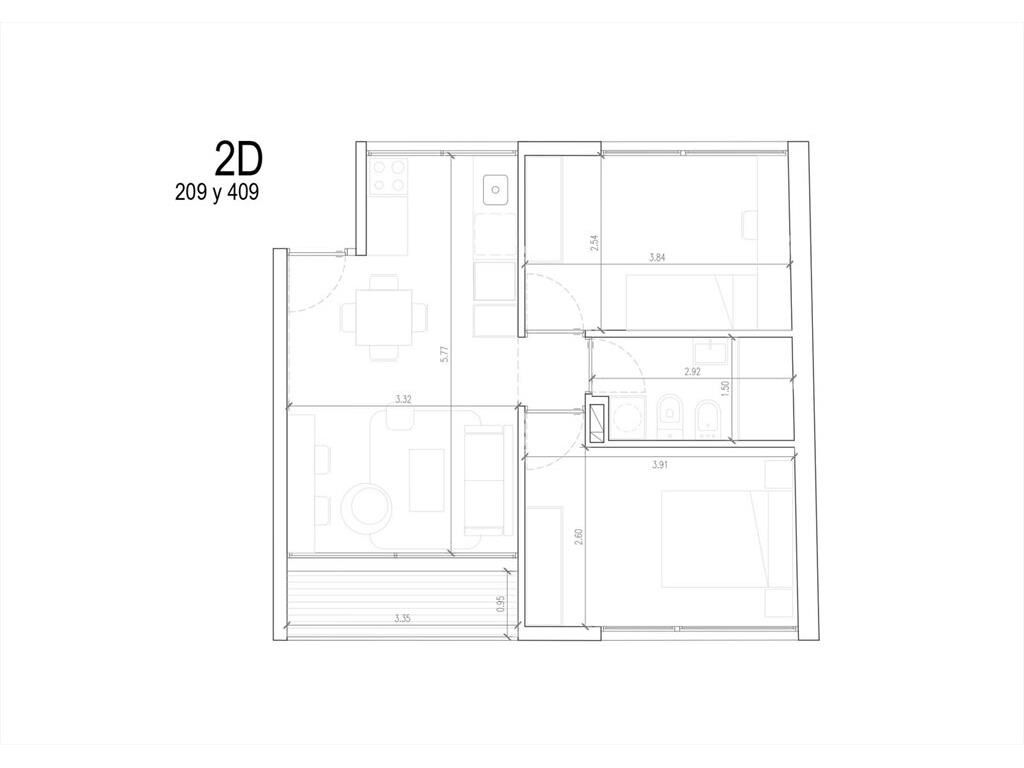 Living comedor con acceso a terraza de uso exclusivo, cocina integrada con bajo mesada. Baño completo. Dos dormitorios.