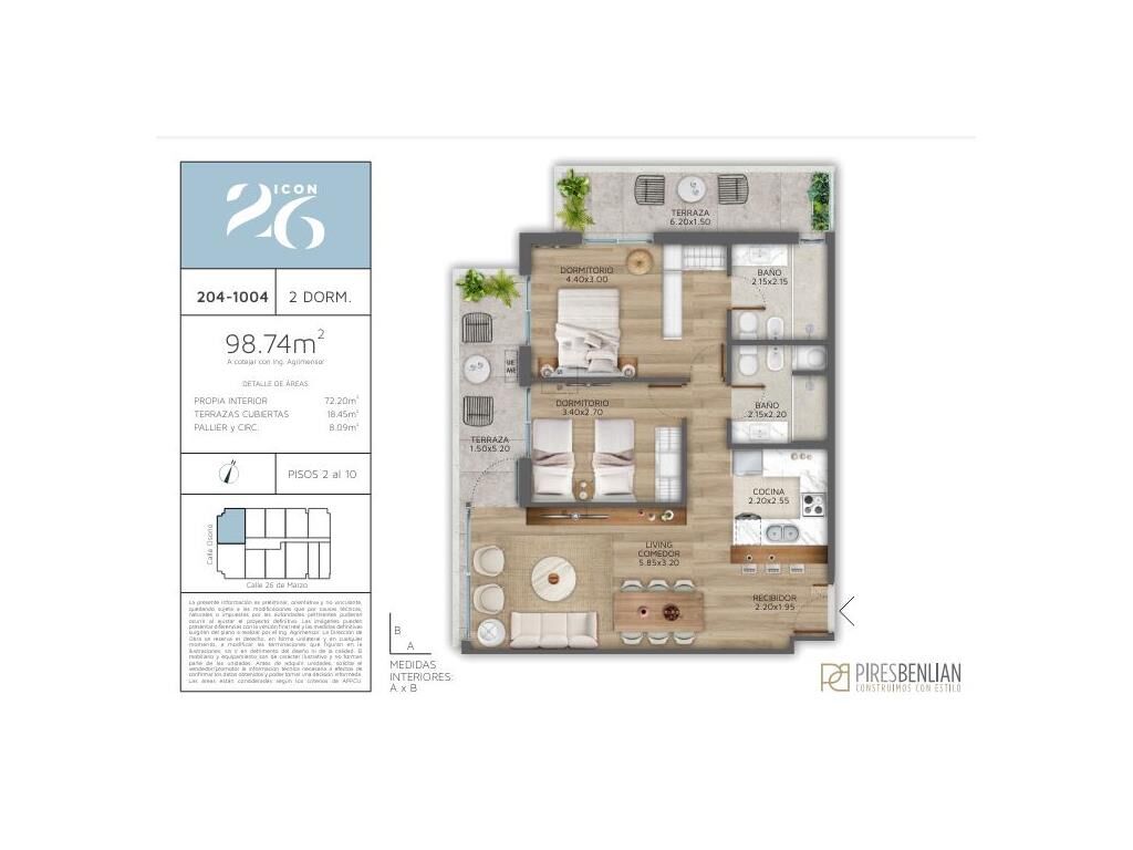 La unidad está compuesta por dos dormitorios, living comedor con salida a terraza, cocina integrada y un baño.
