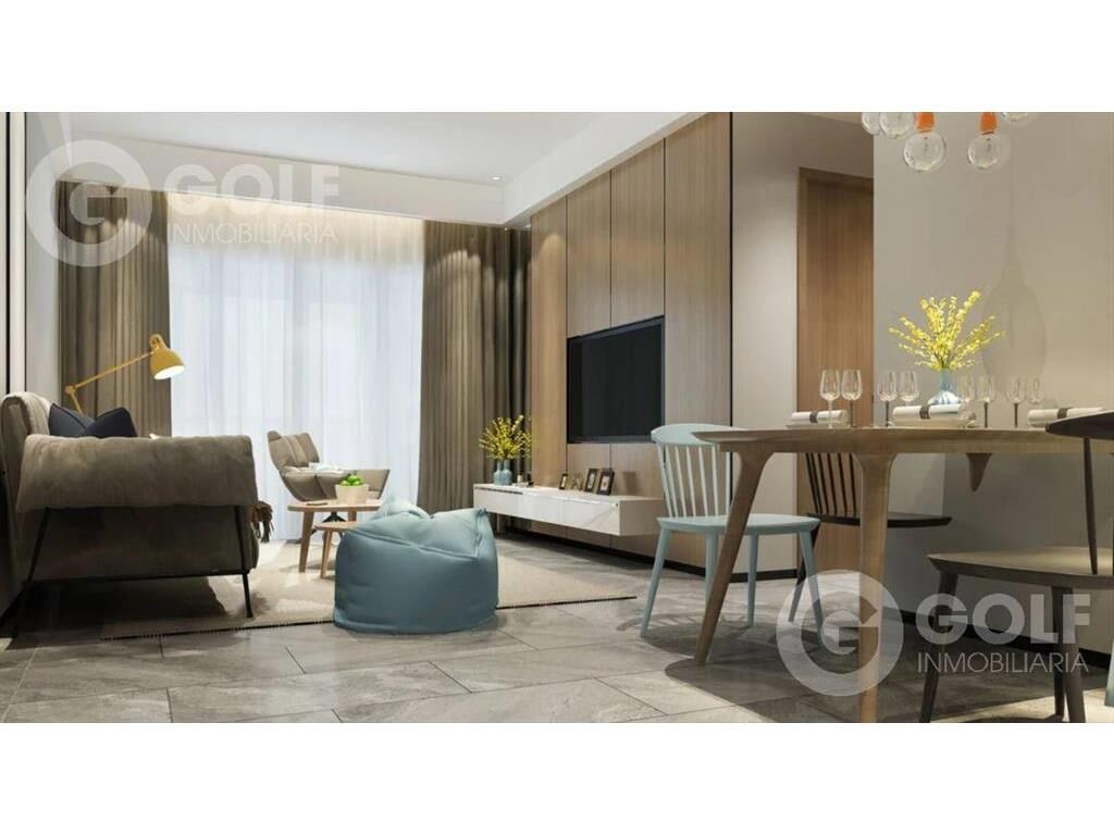 Cocina equipada con muebles bajo mesada y alacenas aéreas, anafe, horno, y campana extractora. Cuentan con encimeras de cuarzo gris y revestimientos de porcelanato.