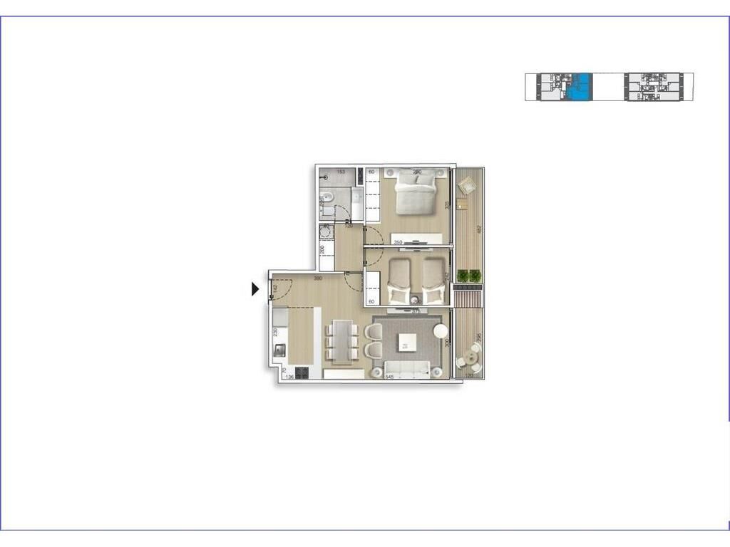 Living comedor con terraza con parrillero, cocina integrada con anafe horno y campana, 2 dormitorios con placares y 1 baño completo.
