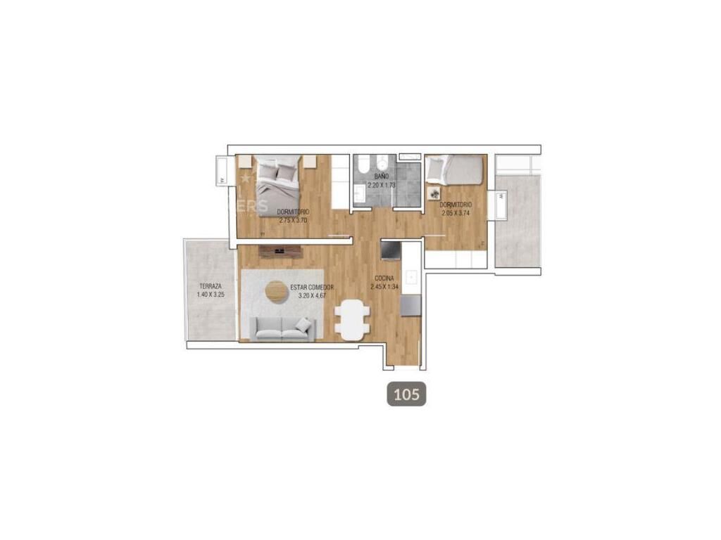 Living comedor con terraza, cocina integrada con aéreos y bajo mesada, 2 dormitorios con placares y 1 baño completo.