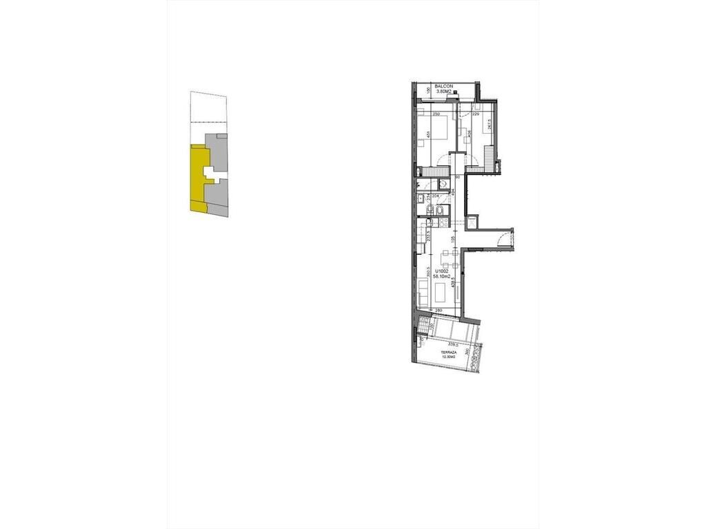 Living comedor con terraza de 16 m2, cocina integrada, 2 dormitorios y 1 baño.