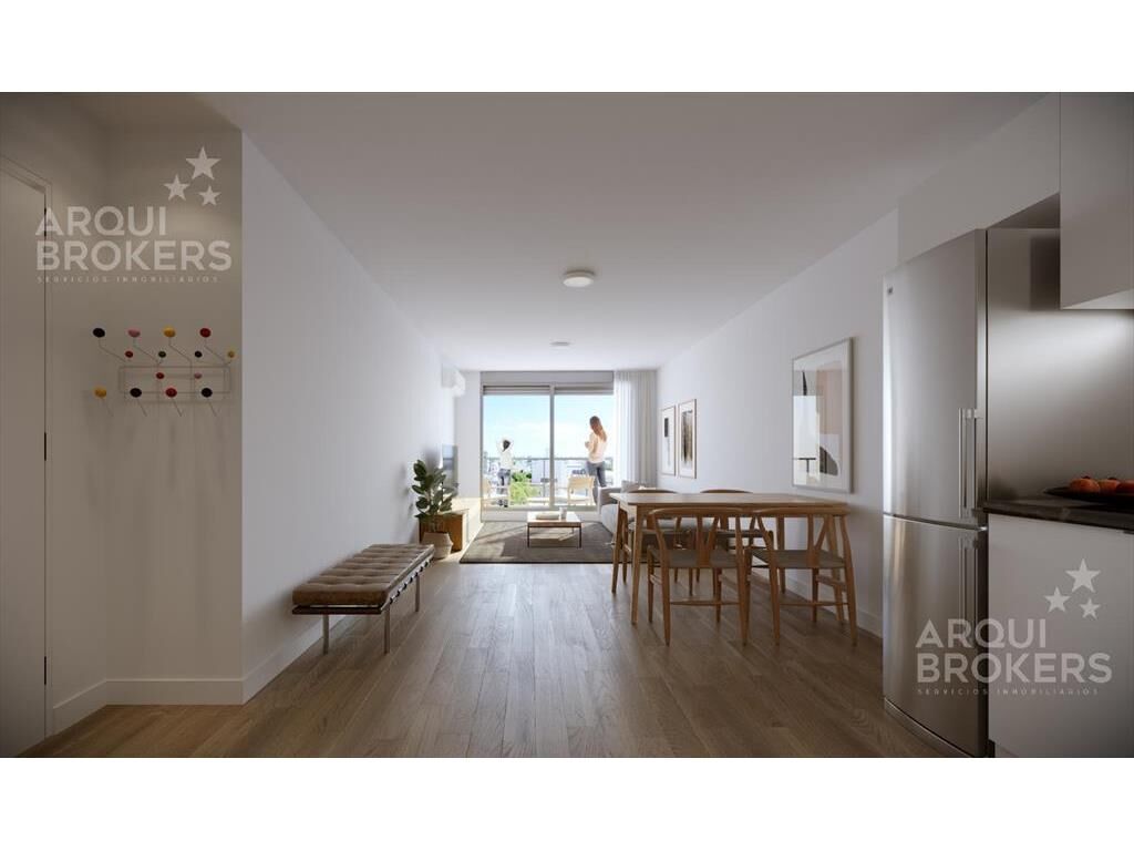 Living comedor con terraza, cocina integrada, 2 dormitorios y 1 baño.