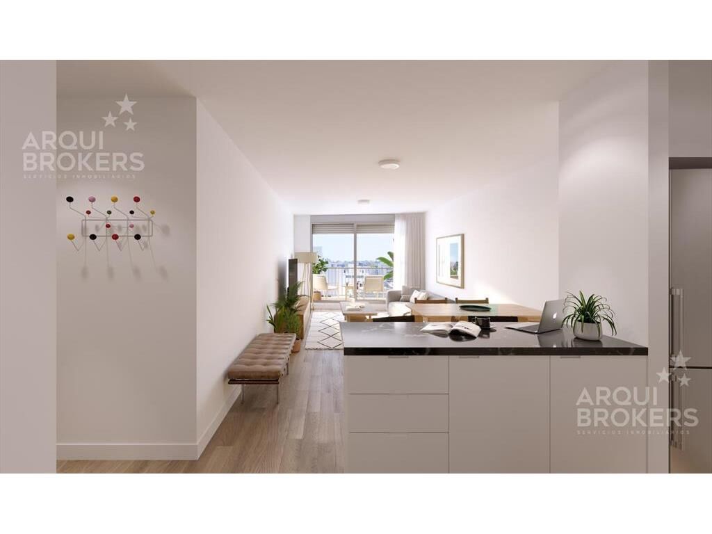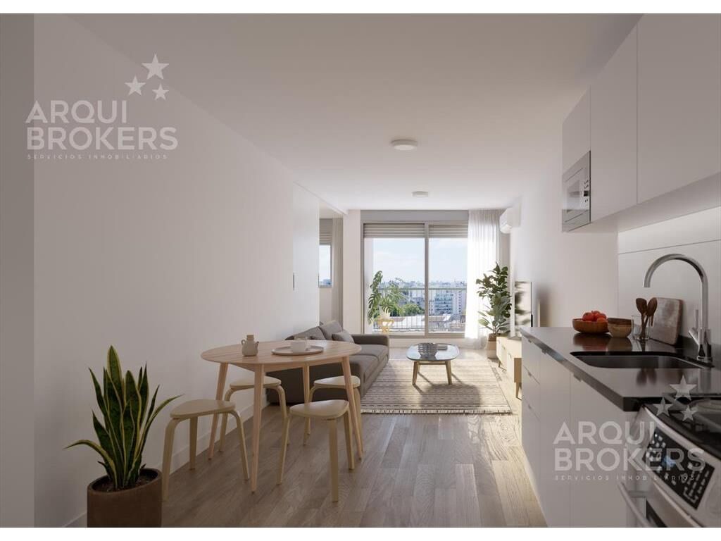 Living comedor con terraza, cocina integrada, 2 dormitorios y 1 baño.