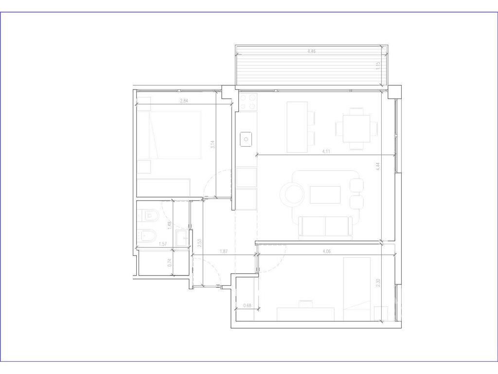 Living comedor con terraza, cocina integrada, 2 dormitorios y 1 baño completo.