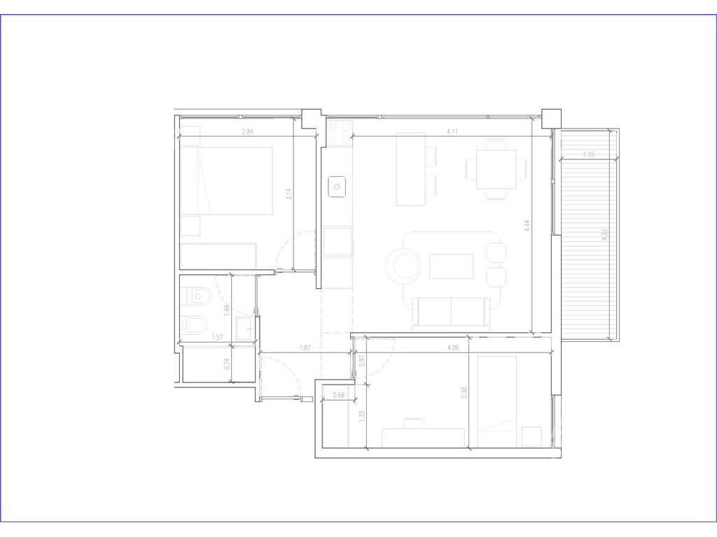 Living comedor con terraza, cocina integrada, 2 dormitorios y 1 baño completo.