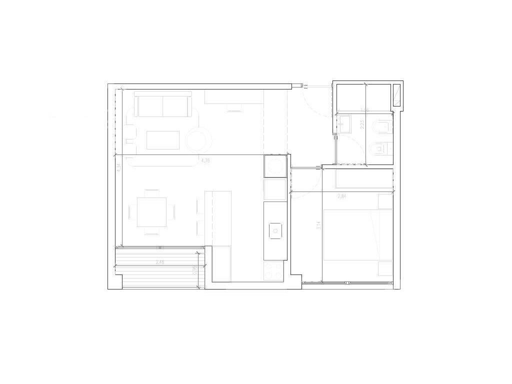 Living comedor con terraza, cocina integrada, 1 dormitorio y 1 baño completo.