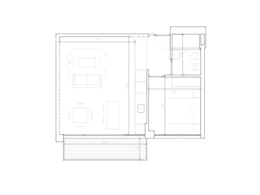 Living comedor con terraza, cocina integrada, 1 dormitorio y 1 baño completo.