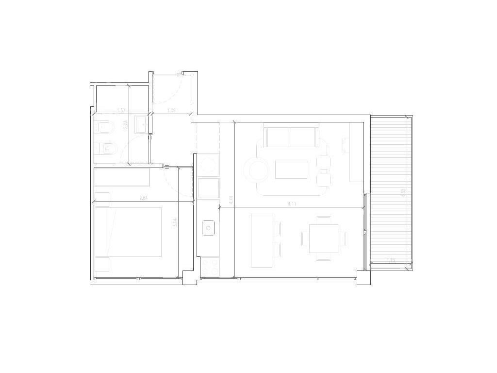 Living comedor con terraza, cocina integrada, 1 dormitorio y 1 baño completo.