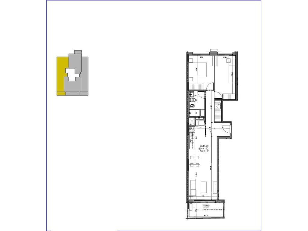 Living comedor con terraza al frente, cocina integrada con placares sobre y bajo mesada, armario para lavarropas y calefón.
