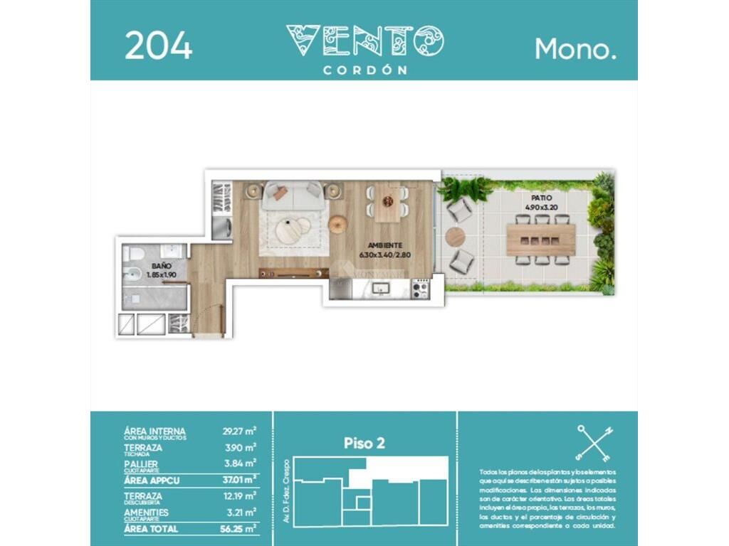 29,27m2 área propia c/muros + 3,90m2 terraza techada + 12,19m2 terraza descubierta + cuotaparte de pallier & amenities = 56,25m2 totales.