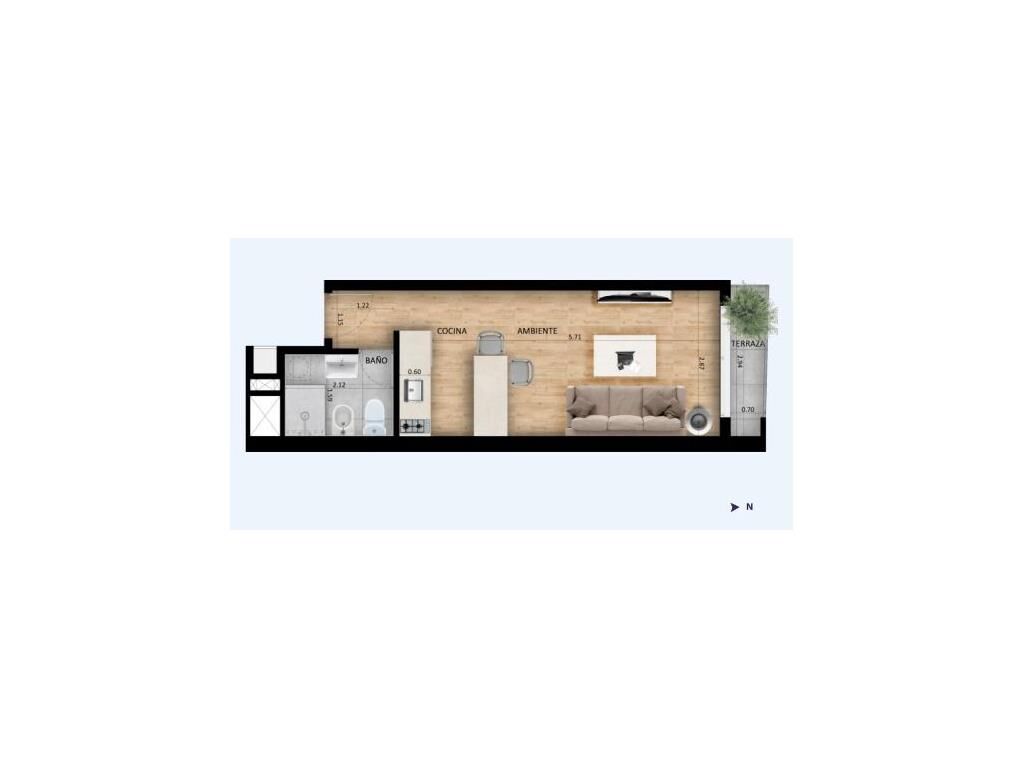 Apartamento Monoambiente con terraza. Cocina integrada con muebles bajo mesada y aéreos . Baño completo.