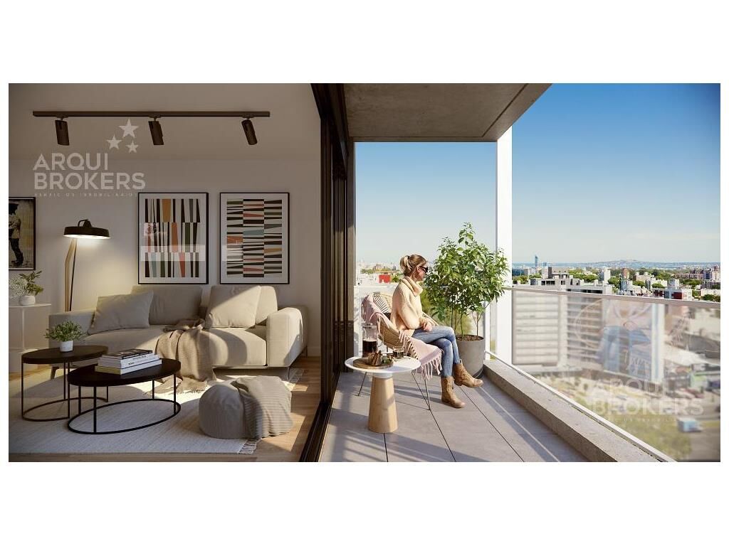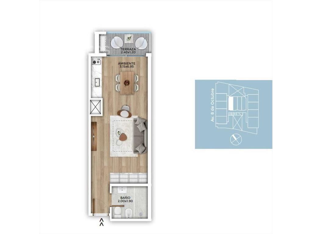 Monoambiente con terraza, cocina integrada y 1 baño completo.