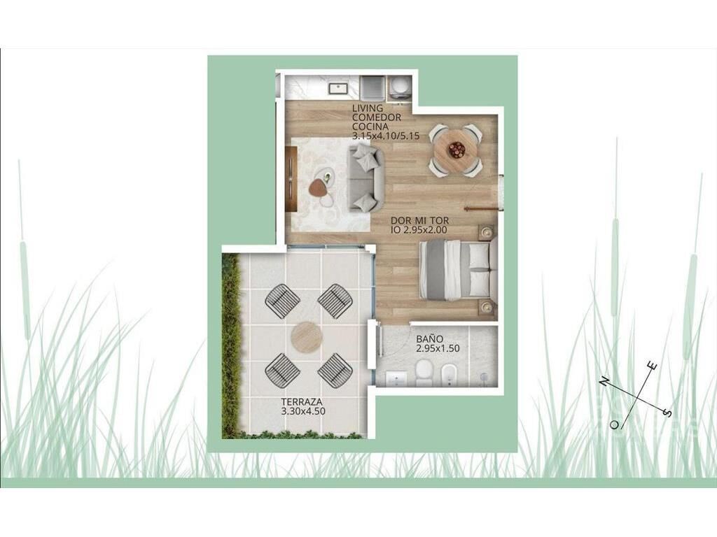 Monoambiente tipo Loft muy fácil de dividir y transformar en 1 dormitorio. Cuenta con terraza, cocina integrada y 1 baño. Patio de 15 m2.
