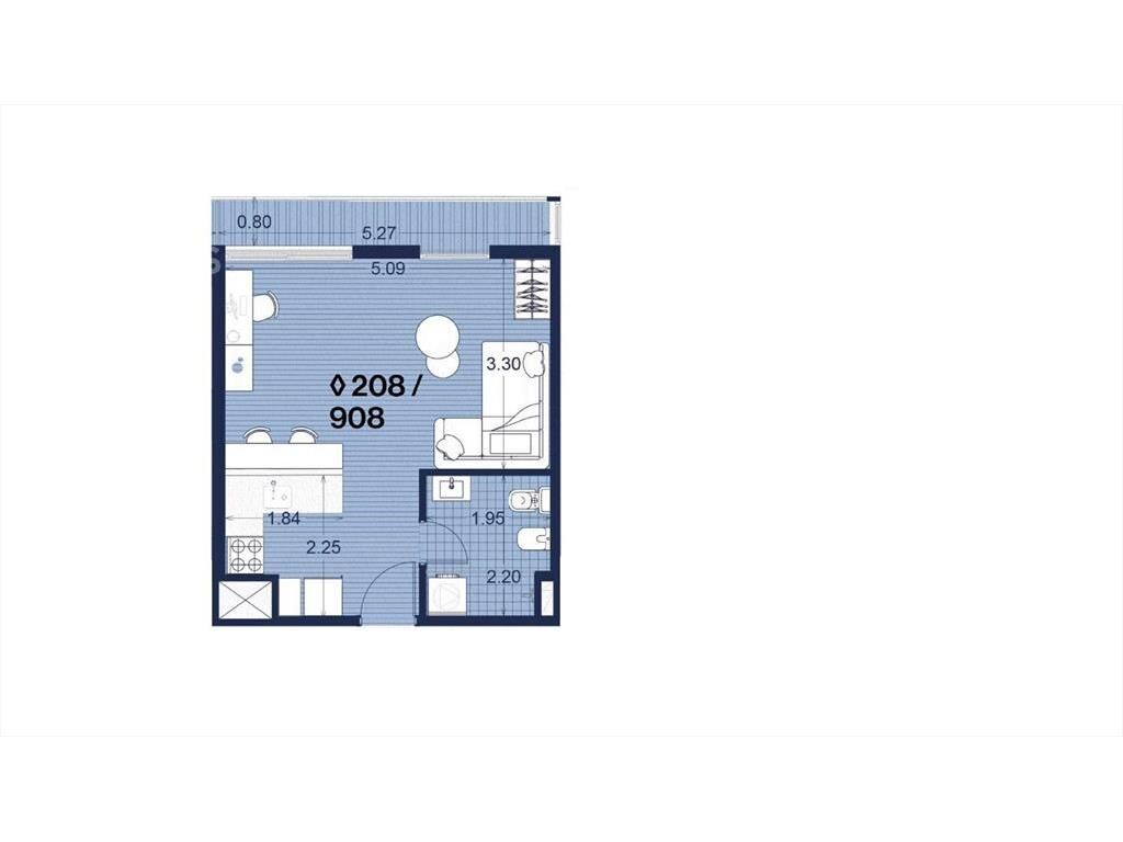 Monoambiente con terraza, cocina integrada y 1 baño completo.