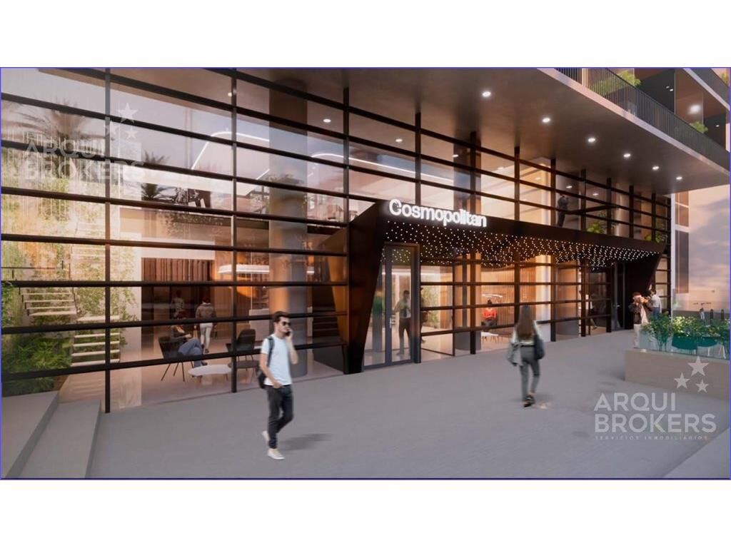 El edificio cuenta con amenities exclusivos como Cowork Café, Open Rooftop Bar, terrazas panorámicas y spa.