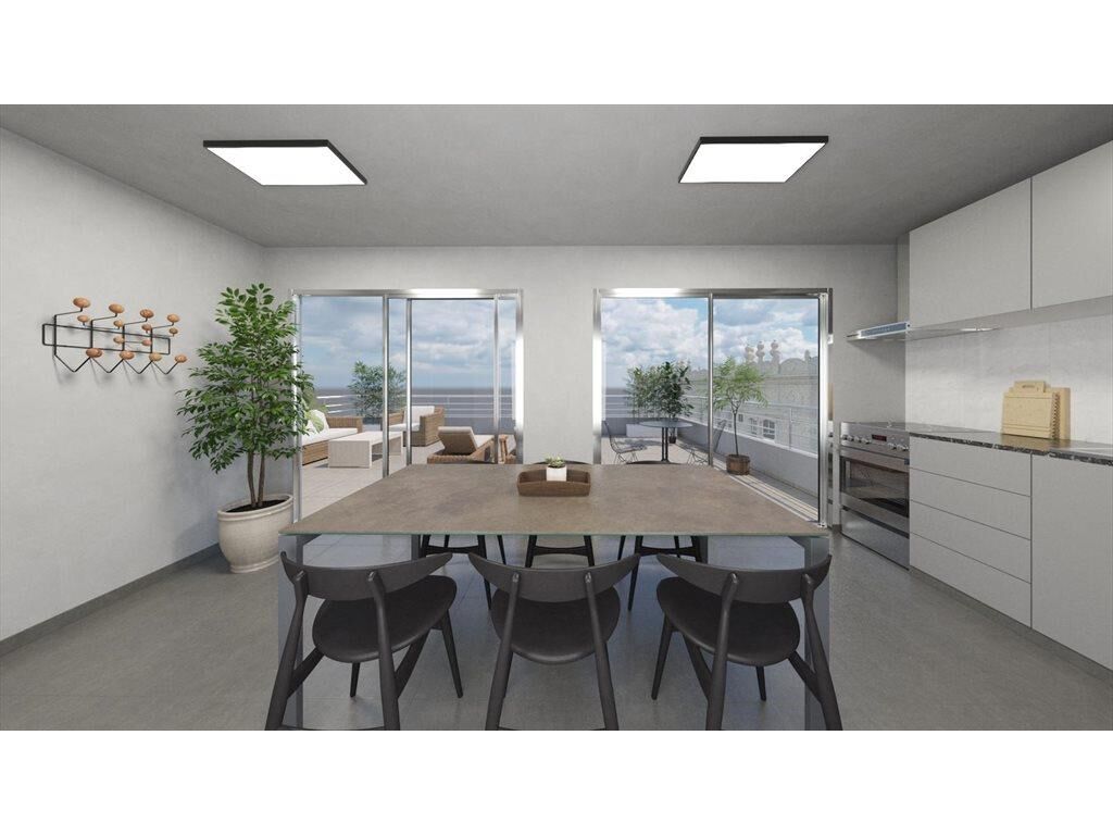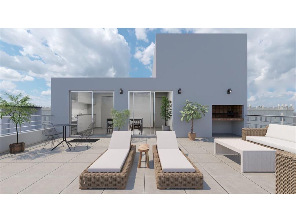 Cocina integrada con mesada tipo "C" creando una barra desayunadora, este ambiente se extiende a la terraza al frente. Baño completo.