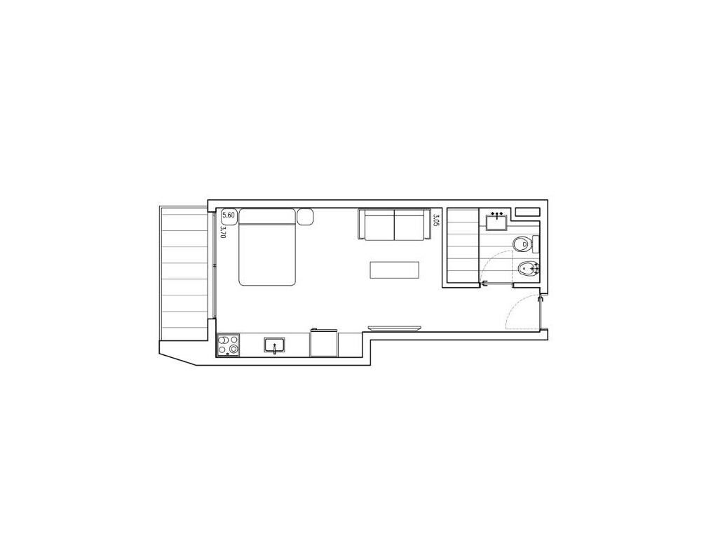 Monoambiente cocina integrada provista de muebles bajo mesada y aéreos, así como un balcón de uso exclusivo y un baño completo.
