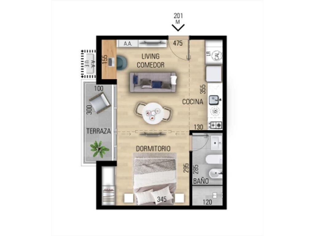 Cocina integrada con muebles aéreos, bajo mesada y anafe. Baño completo. Previsión de aire acondicionado en living y dormitorio. Aberturas de aluminio, terminación color negro con cortina de enrollar integrada, pavimento vinílico de alta resistencia en listones símil madera.