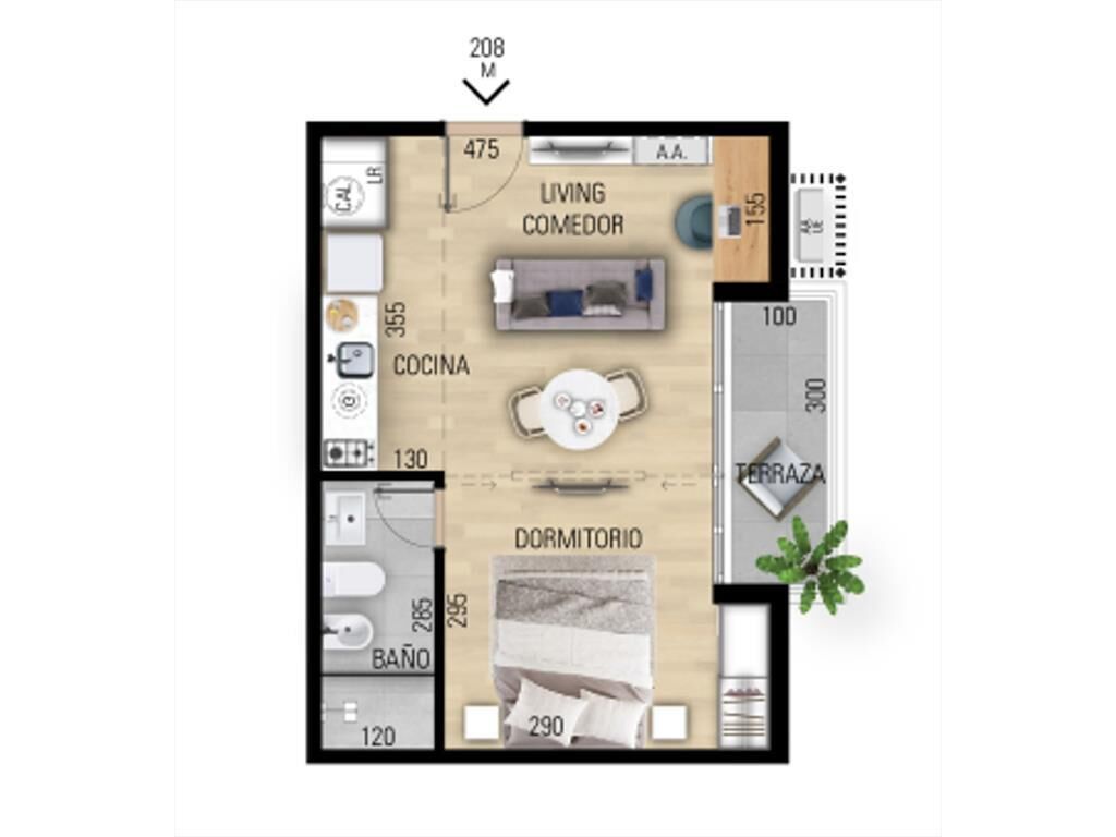 Cocina integrada con muebles aéreos, bajo mesada y anafe. Baño completo. Previsión de aire acondicionado en living y dormitorio. Aberturas de aluminio, terminación color negro con cortina de enrollar integrada, pavimento vinílico de alta resistencia en listones símil madera.