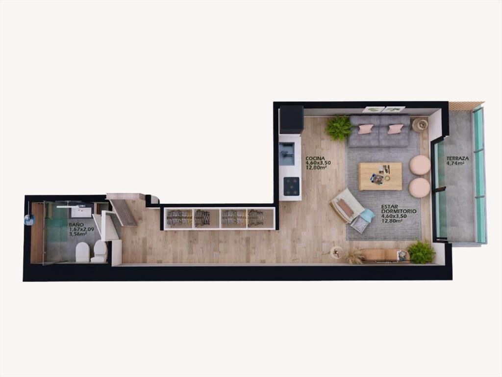 Superficie interior: 34.85 m² / Terraza: 4,74 m² = Superficie total: 39.69 m²