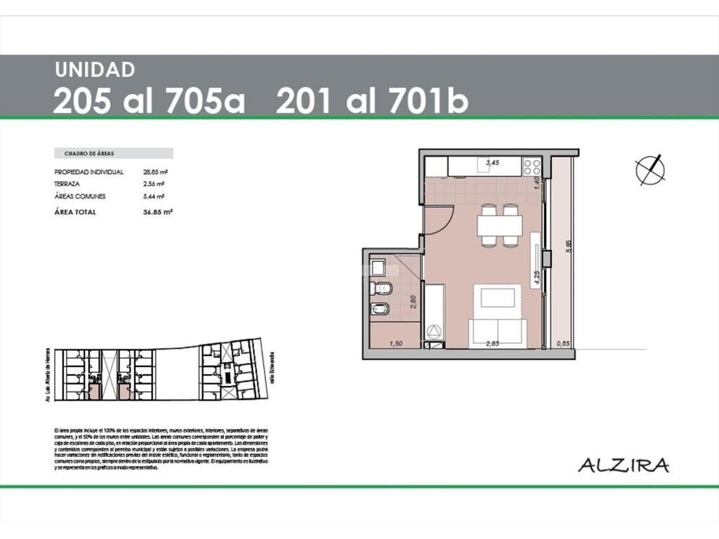 METRAJE: 28,85m área propia + 5,44m área común + 2,56m área terraza = 36,85m totales.