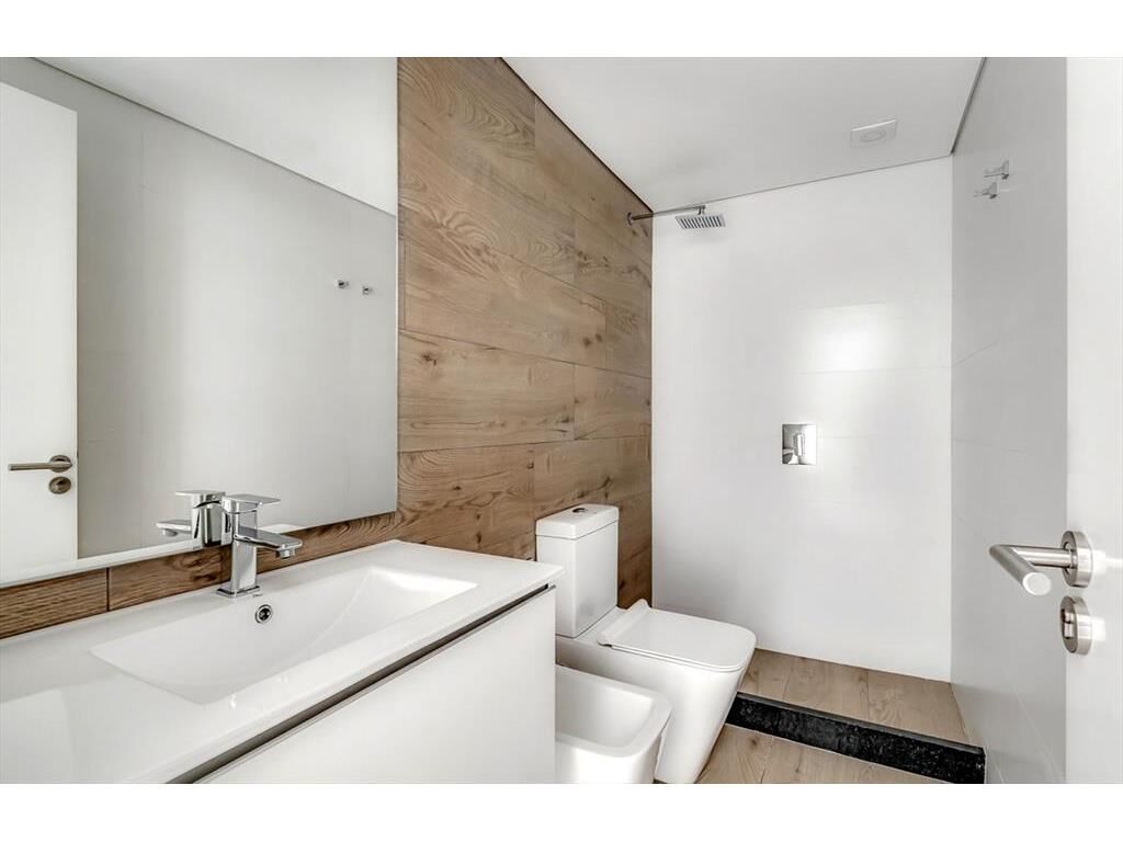 El apartamento cuenta con dos cómodos dormitorios, uno de ellos en suite, ambos con placares empotrados de puertas corredizas. Los baños, equipados con muebles con bacha integrada, espejos y grifería cromada, están diseñados para el confort diario.